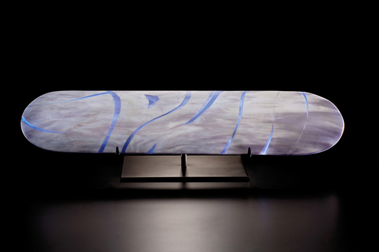 Spun 31x8x9"Kilnformed glass, wheel cut, on metal base SOLD